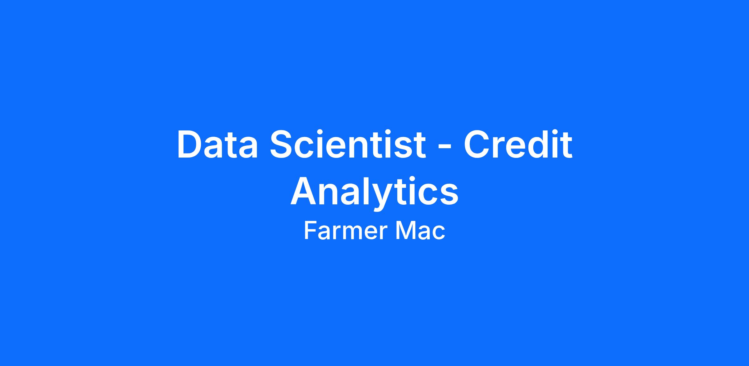 The Data Scientist - Credit Analytics will be an integral part of the Credit Analytics team, reporting directly to the Director - Credit Analytics, and working closely with the Credit team and key stakeholders in Finance, Enterprise Risk Management, and the Business Line. This role will have a direct impact on Farmer Mac’s credit risk models and portfolio credit risk reporting products, with visibility to senior management.