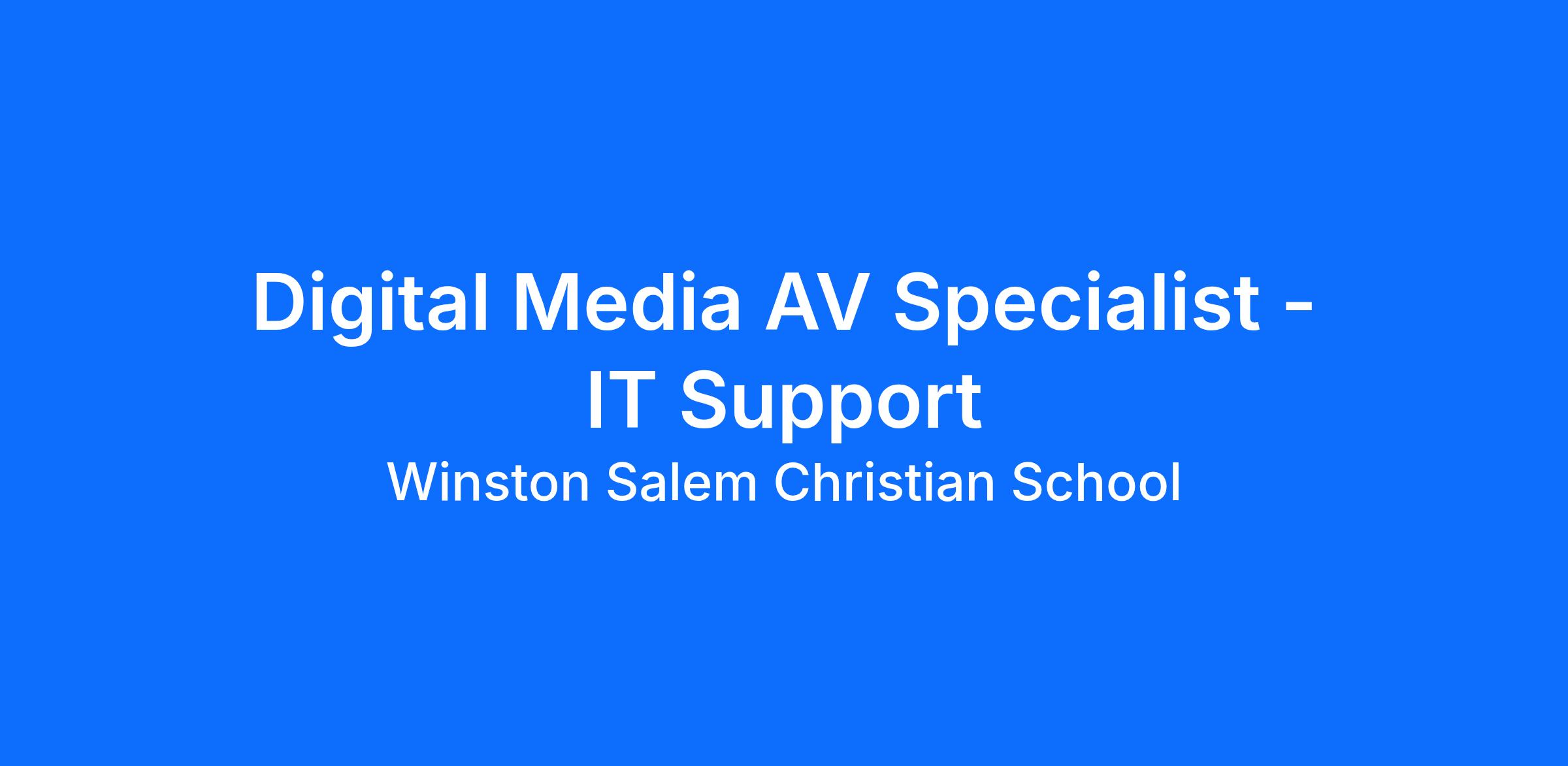 Job Title: Digital Media & AV Specialist Location: Winston Salem Christian School, Winston-Salem, NC Position Type: Full-Time (10 Month Teacher Position + 2 weeks; $32,000) Start Date: August 1, 2025