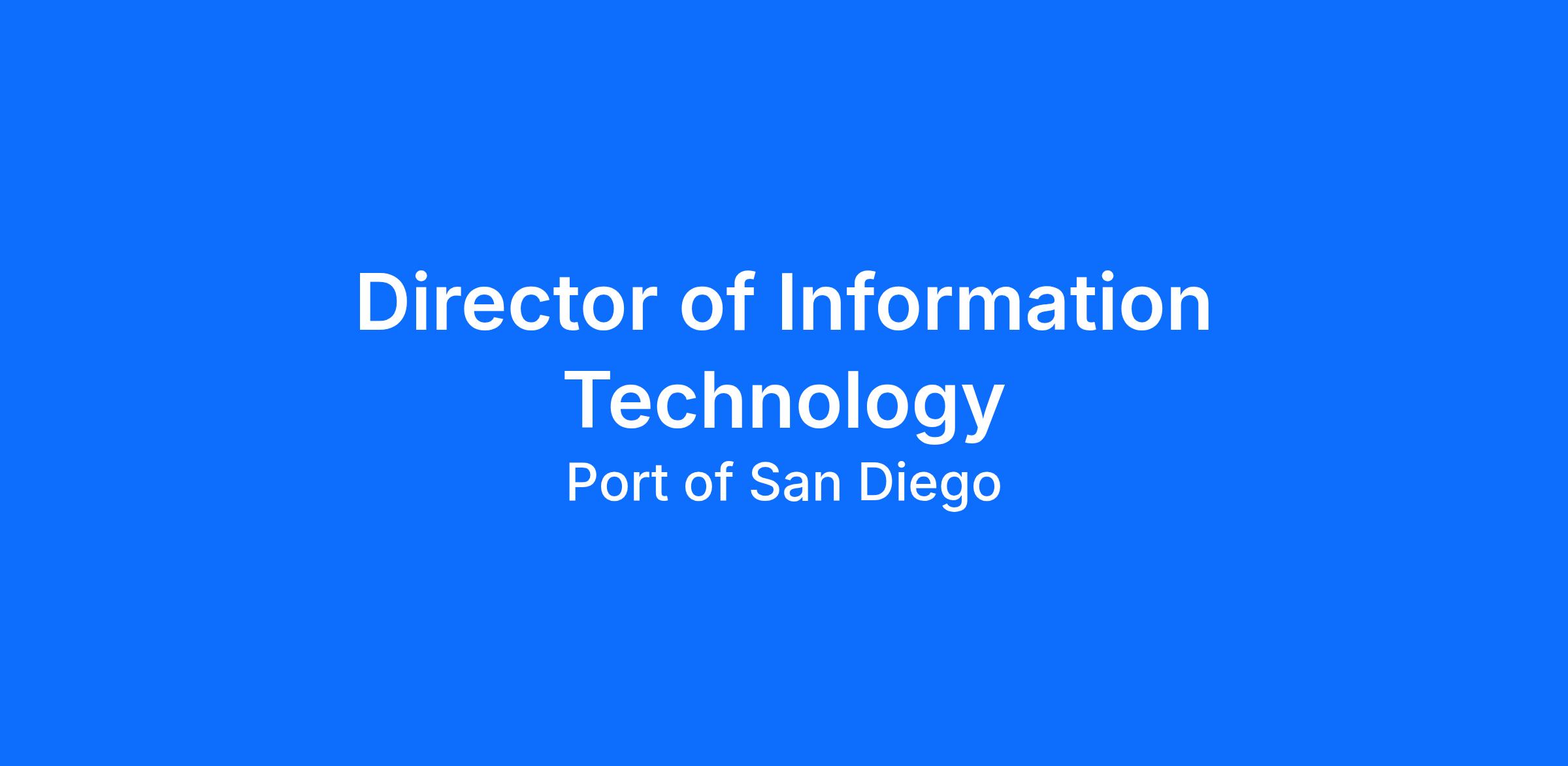 The Port of San Diego is looking for a forward-thinking Director of Information Technology that will drive innovation, enable strategy and execute a technology vision that aligns with the Port's goals and enhances operational efficiency. The ideal candidate will bring a balance of strategic insight and hands-on-expertise, and is a dynamic leader that excels at building partnerships across departments. The Director of Information Technology at the Port of San Diego oversees a large department (35 positions and multiple consultants) and is responsible for a team that supports over 125 business and specialty applications.