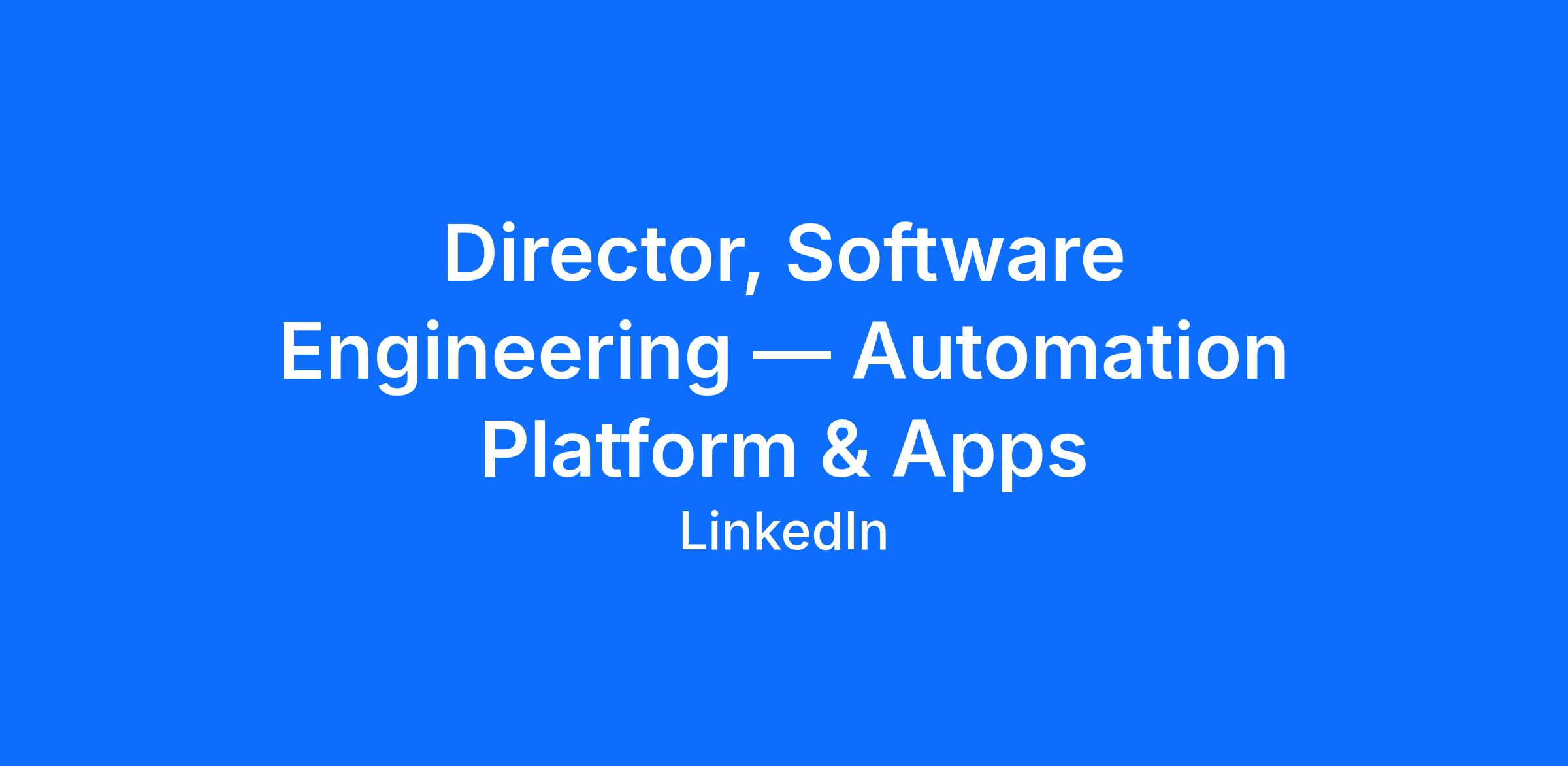The Director of Automation Platform & Apps is a senior leadership role within LinkedIn's Developer Productivity & Experience organization. This role leads the team responsible for building the platform and tooling that puts AI to work across LinkedIn's R&D ecosystem — both by deeply integrating industry AI agents with LinkedIn's internal systems, data, and developer workflows, and by providing the foundational platform on which all internally developed AI agents are built and operated. The team also develops LinkedIn-specific automation applications that drive productivity at scale across the company's R&D organization.