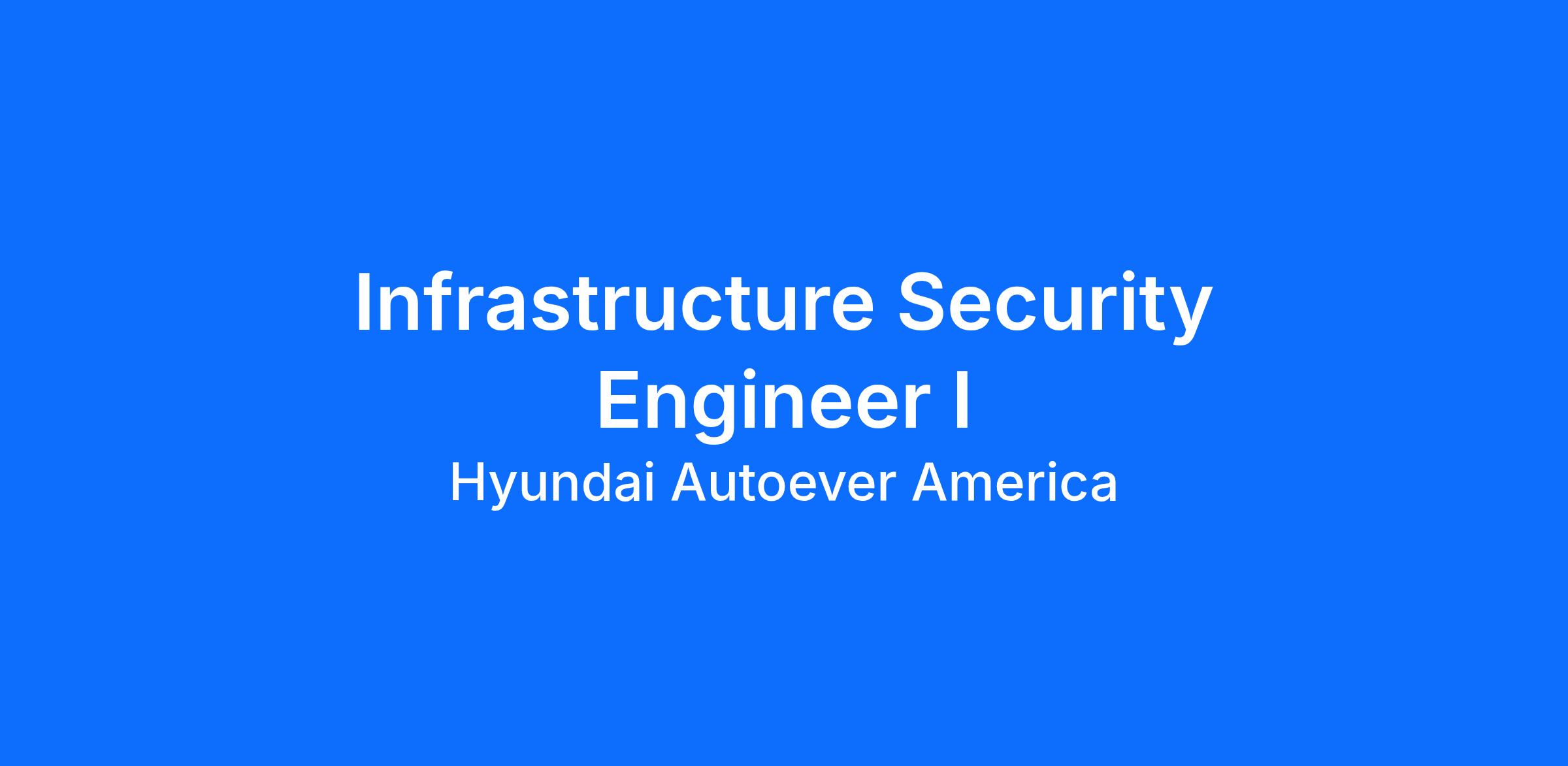 Role Overview: The Infrastructure Security Engineer I will serve as an important member of the Information Services team supporting the broader Hyundai family of companies. This role participates in day‑to‑day information security operations, helping protect corporate systems, networks, and MES (Manufacturing Execution System) environments. The position supports intrusion detection, incident response, vulnerability assessments, application security, and compliance activities. The individual will assist in implementing, operating, and improving security technologies such as DLP, Antivirus, IDS/IPS, Endpoint Protection, Database Activity Monitoring, and Web Application Firewalls across both office and manufacturing environments.