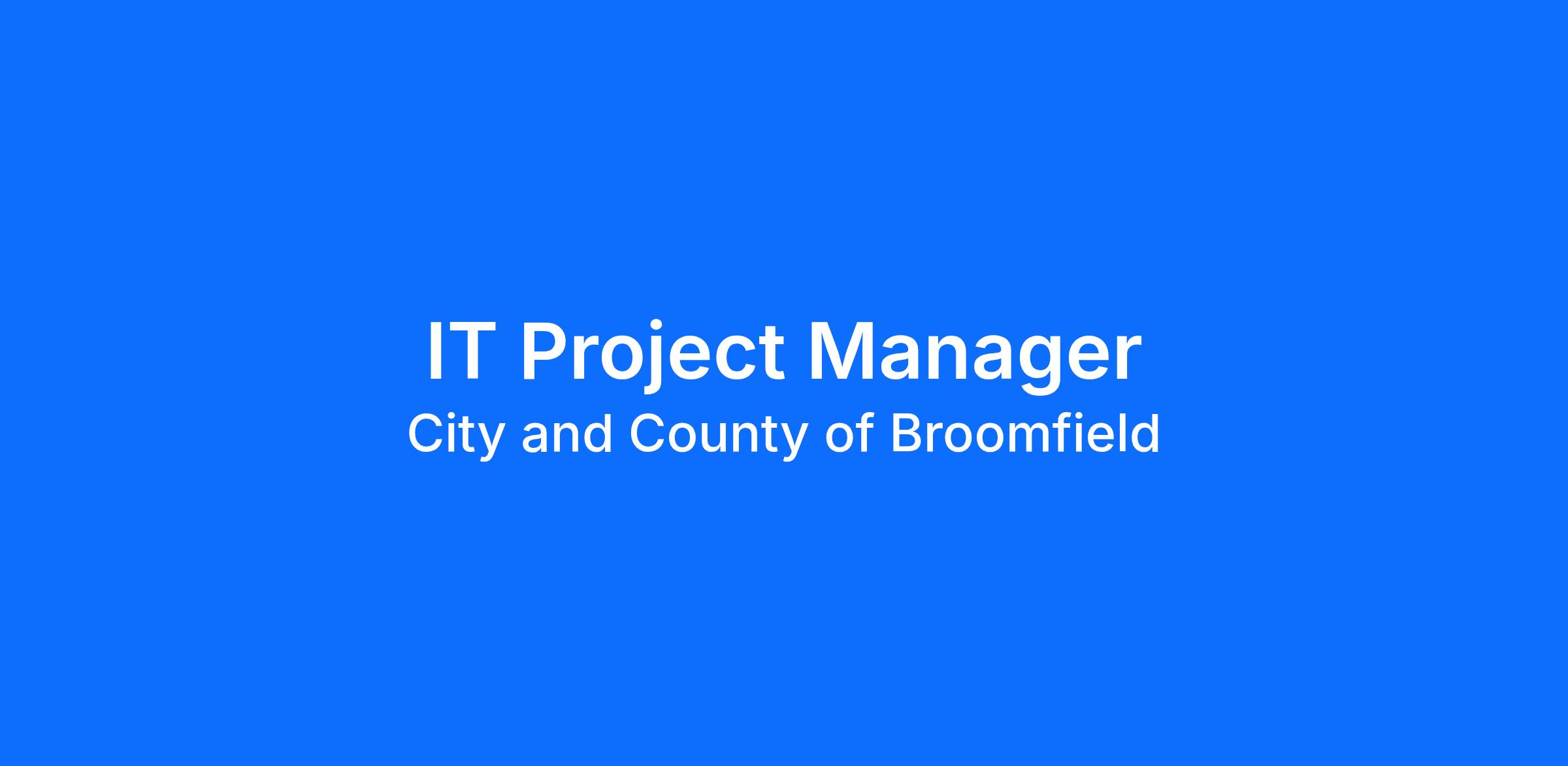 The IT team at the City and County of Broomfield is passionate about applying their skills and talents to help the community. If you thrive on supporting the adoption, utilization, and integration of the City's core technologies through engagement with customers then the IT Project Manager position might be the right fit for you. The Project Manager leads technology projects from initiation to close using agility, flexibility, and an end-user-centric approach to ensure high user adoption and user satisfaction.