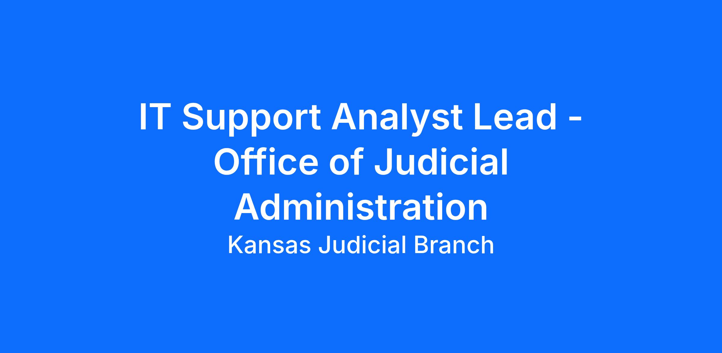 Position number: K0045017 Location of Employment: Office of Judicial Administration, Topeka, KS 66612 Position Title and Salary: IT Support Analyst Lead, grade 47, $ 78, 404.73 annually Kansas Judicial Branch BenefitsState Employment Center - Benefits (ks.gov)