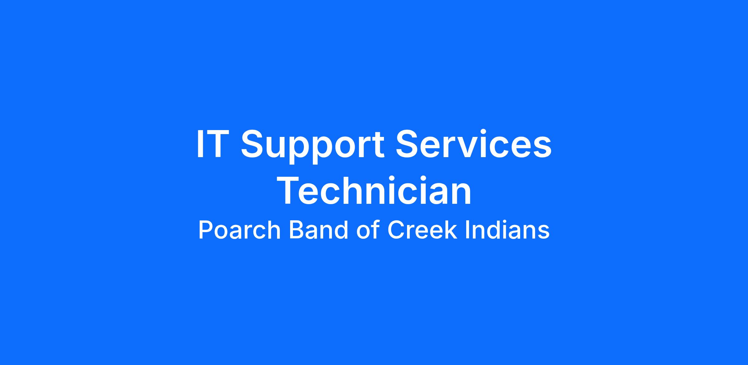 Join Our Mission:The Poarch Creek Indians place a high value on individuals who share our commitment to community, tradition, and progress. As Alabama's only Federally Recognized Native American Tribe, we take pride in a history that spans generations and is deeply rooted in resilience and cultural heritage. Our mission is to uplift the lives of our Tribal Members, preserve our traditions, and drive innovation for a thriving future. If you are passionate about serving with purpose and authenticity while fostering trust, unity, and growth, we welcome you to join us on this meaningful journey.About the Role:The IT Support Services Technician provides front-line technical support to internal users across the organization. This role is responsible for troubleshooting hardware, software, and connectivity issues, resolving IT incidents, and ensuring reliable day-to-day technology operations. The position reports to the IT Support Services Manager and supports the Tribe’s commitment to service, accountability, and integrity.This position reflects PCI’s core values of Perseverance, Opportunity, Accountability, Respect, Culture, and Honesty.Key Responsibilities: