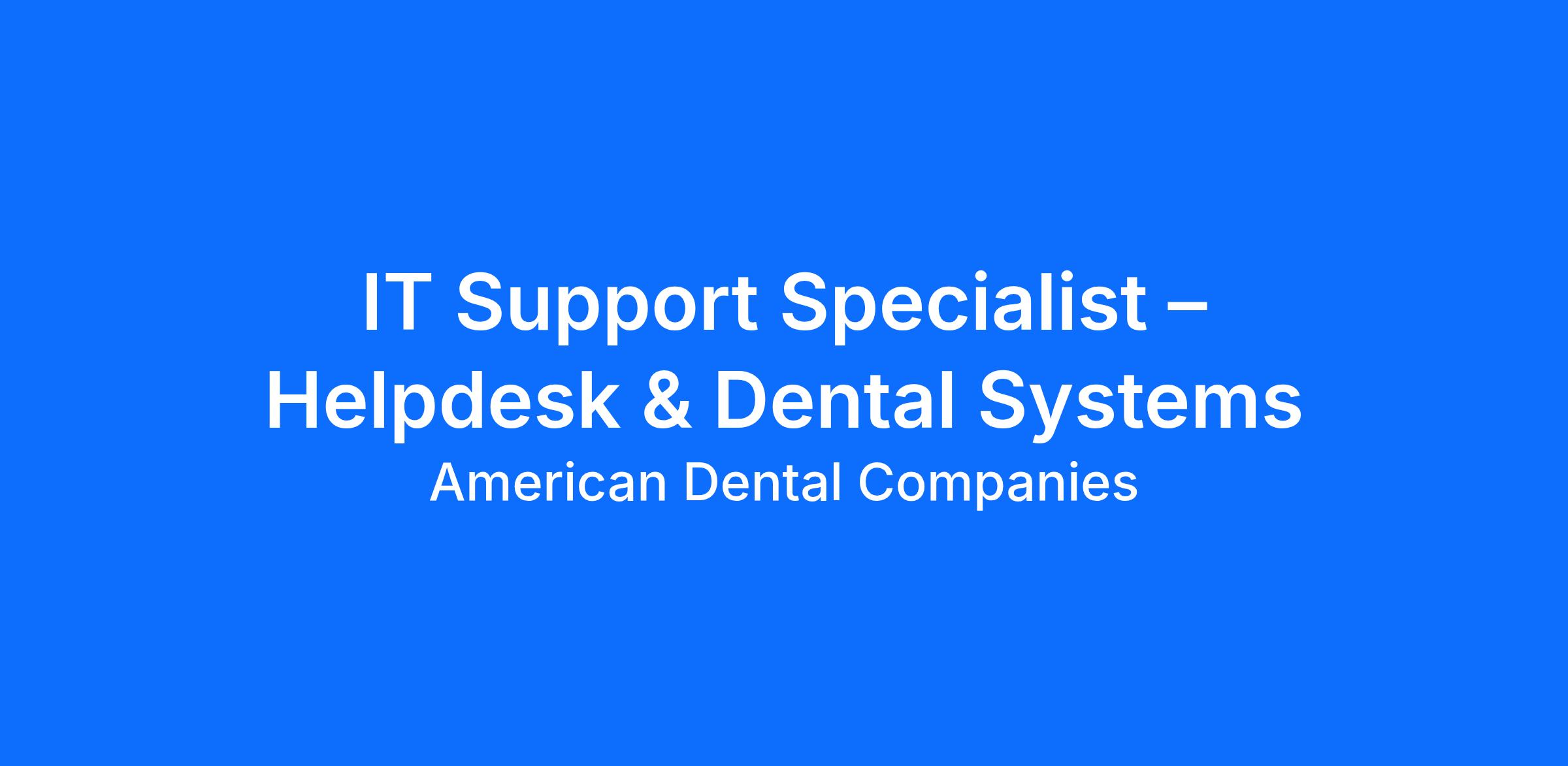 American Dental Companies is seeking a dedicated IT Support Specialist – Helpdesk & Dental Systems to provide frontline technical support for our employees and clinics.