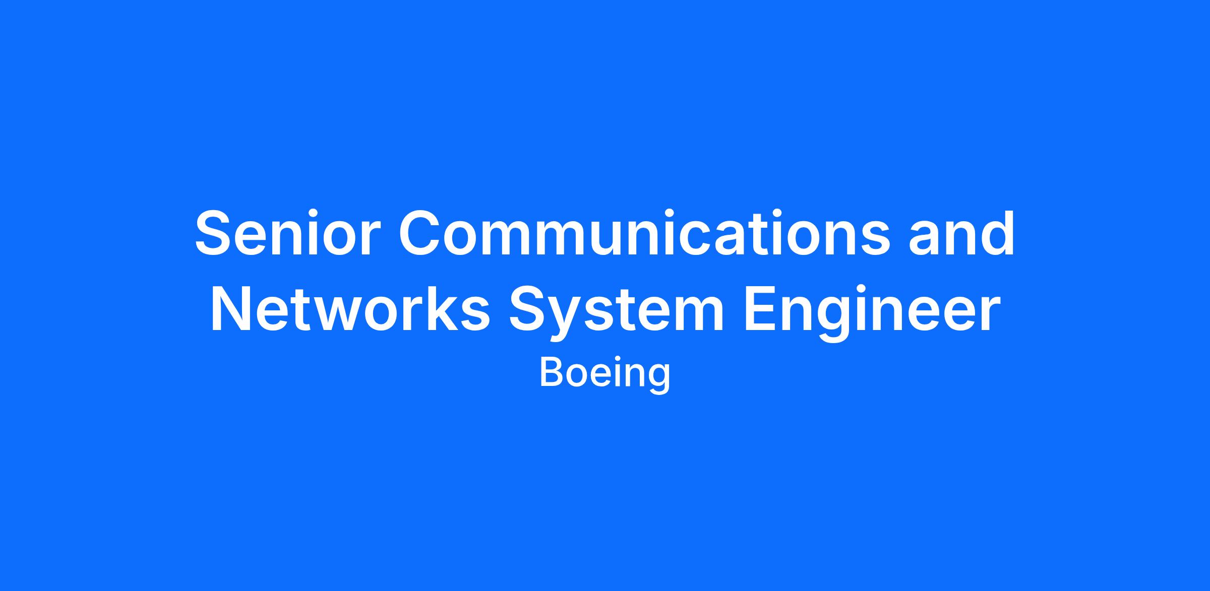 The Boeing CompanyThe Boeing Defense, Space & Security (BDS) organization, Space and Launch Division, is seeking a Senior Communications and Networks System Engineer (Level 4) to join the Red LAN program in Colorado Springs, CO.