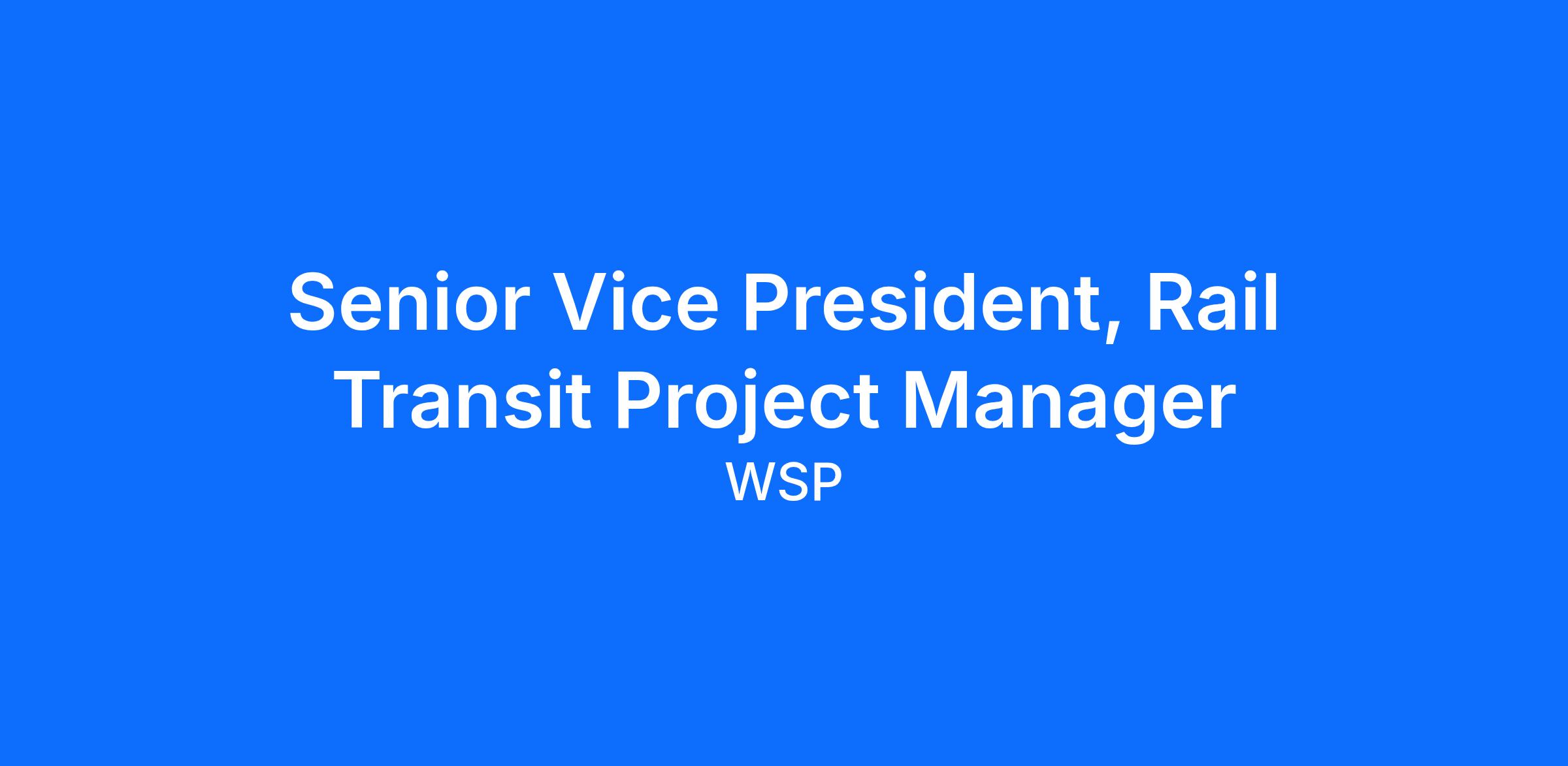 WSP is currently initiating a search for a full-time Senior Vice President, Rail Transit Project Manager. This position will sit within the Northwest Pacific Major Projects Team. This position has been created to support some of the recent rail transit project wins and on-going pursuits in the Seattle and larger Northwest Pacific transit and transportation market. This individual will work closely with our Transportation & Infrastructure Team and contribute to a growing organization that helps clients advance complex transit initiatives and solve their most pressing mobility challenges.
