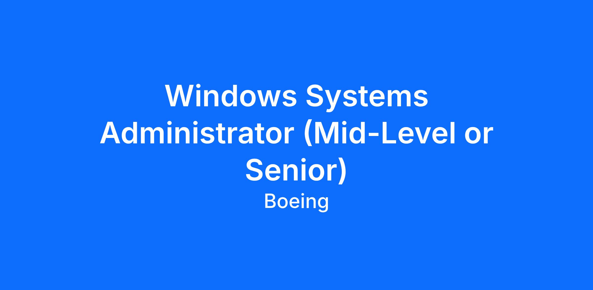 The Boeing CompanyThe Boeing Company’s Specialized Infrastructure Operations Organization is currently seeking a Windows Systems Administrator (Mid-Level or Senior) to join the team in Berkeley, MO.
